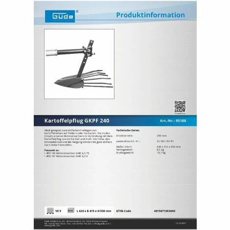 Güde Kartoffelpflug GKPF240 Ackerpflug Pflug für Einachser Kartoffeln