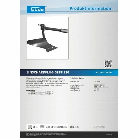 Güde Einscharfpflug GEPF 220 Gartentechnik Kombigeräte Pflug Anbauwerkzeug