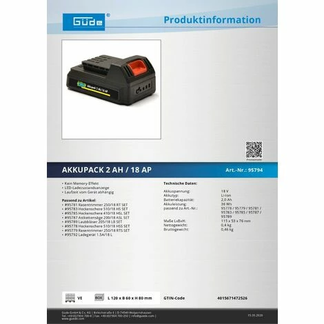Güde Ersatzakku 2 Ah/18AP Li-Ion Akku für Rasentrimmer 250/18 RT 95794