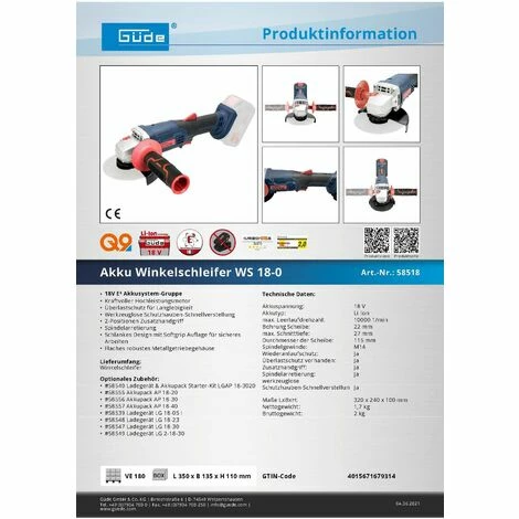 Güde Q9 18V Winkelschleifer WS18-0 mit LGAP18-3020 Akku und Ladegerät
